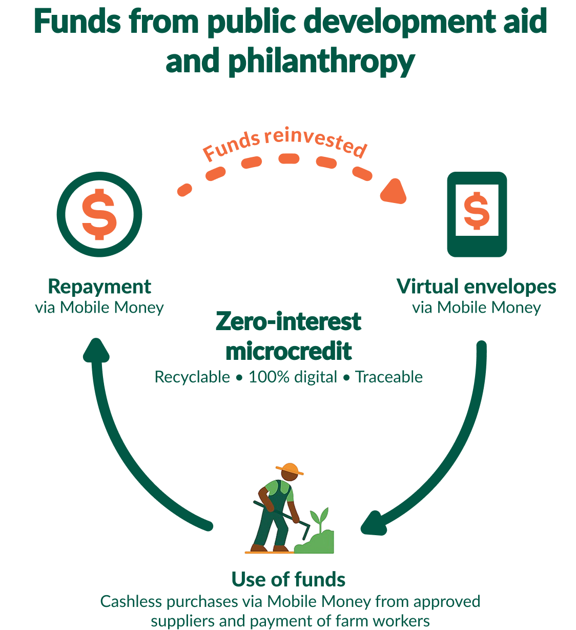 We transform these resources into circular zero-interest microcredit, distributed as virtual envelopes via Mobile Money, and structured around a circular model